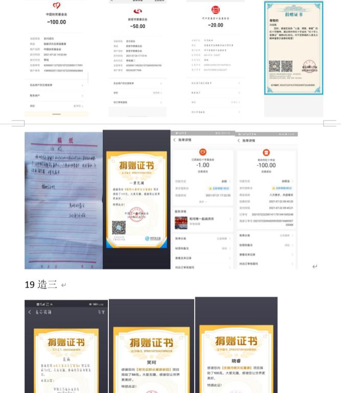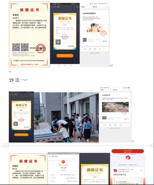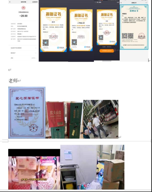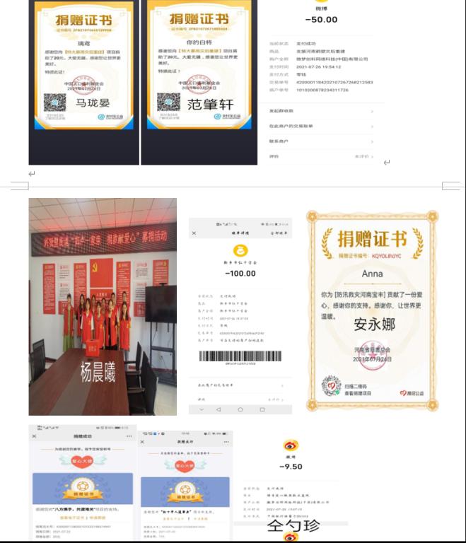7月20日特大暴雨倾覆整个郑州市,短短的数小时之内,150个西湖的水量淹没了道路、淹没了车辆、淹没了桥梁。之后,持续降水不断增强,新乡告急,鹤壁告急,卫辉被淹,扶沟被淹……。已放假回家的太阳成集团tyc33455cc的师生勇于担当,积极行动起来,通过各种方式途径为抗洪救灾尽自己微薄之力,为郑州加油,为河南加油!从20日至今,我院先后有146名师生捐款捐物,捐款合计6290元,矿泉水99提,大米800斤,方便面10箱,火腿肠1箱,衣物若干,5人参加志愿者活动。