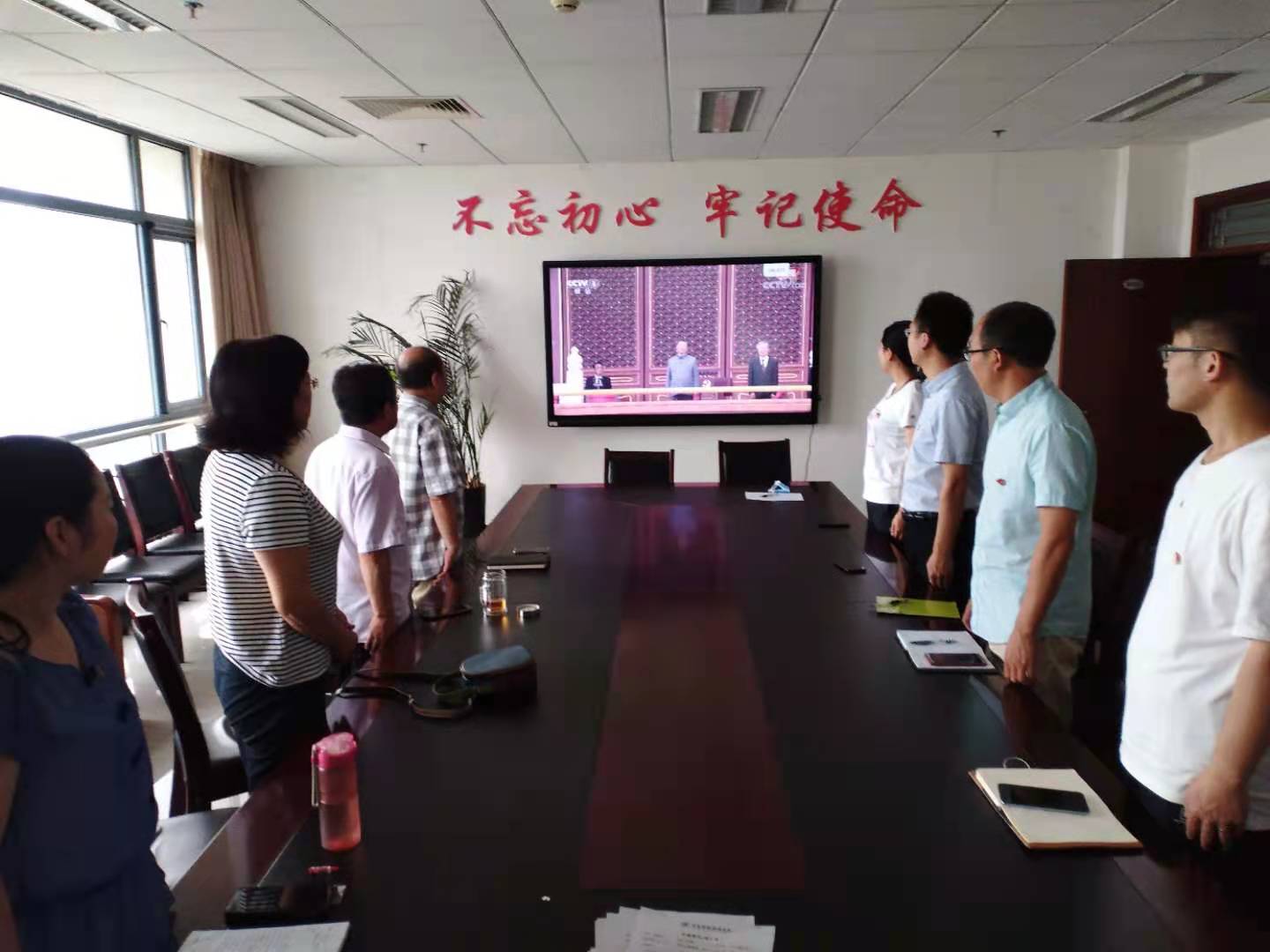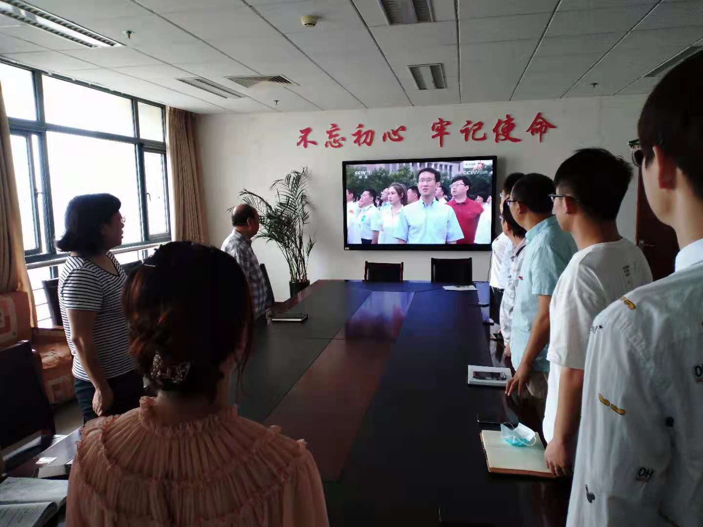 庆祝中国共产党成立100周年大会上午8:00准时开始。党总支副书记刘星带领参加观看的老师们起立唱国歌,共同聆听习近平总书记的讲话。