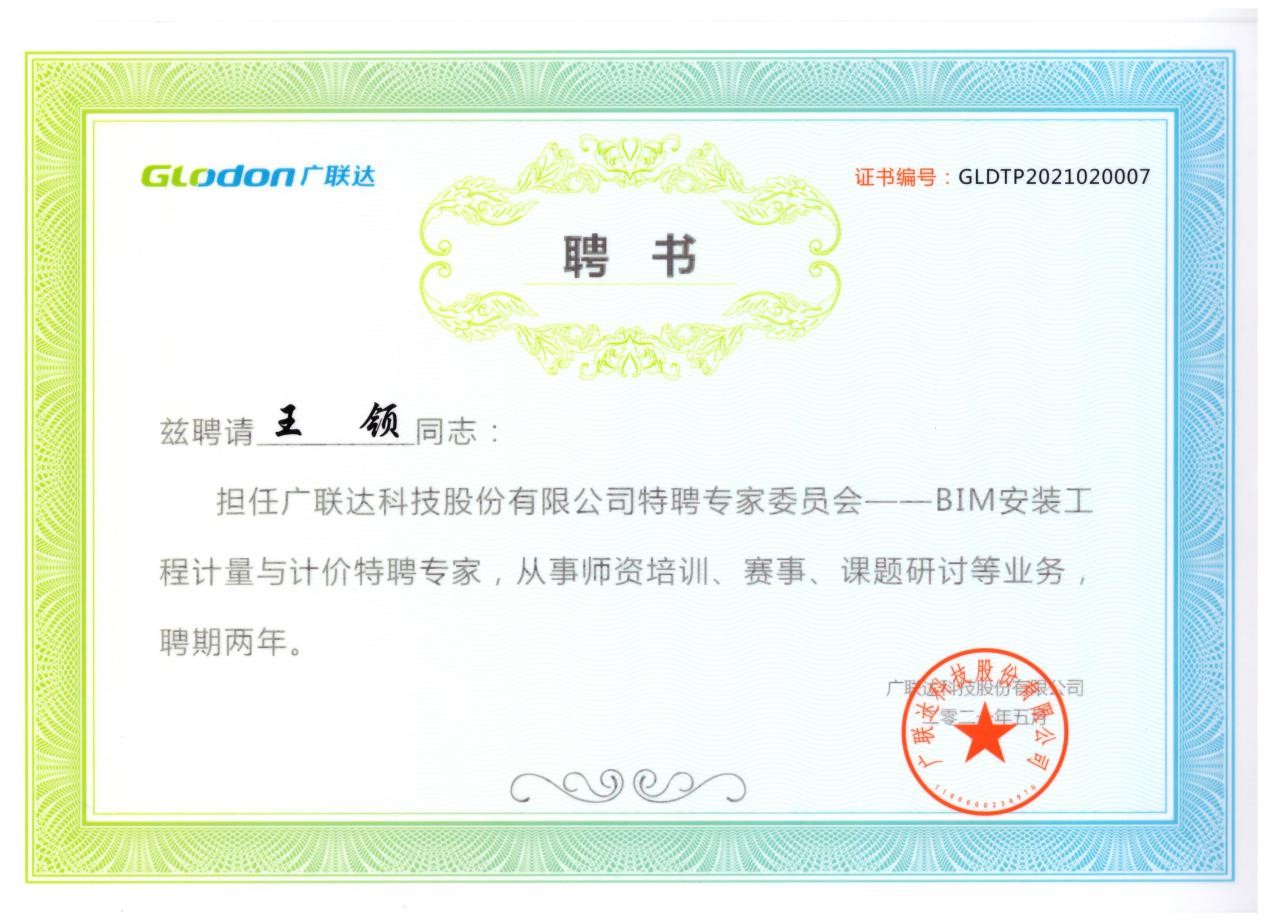 2021 年5月我院工程造价专业教师王领和陈玉娇参加了广联达科技股份有限公司在青岛举办的全国建筑类高校专家讲师研修班。王领老师参加了BIM 安装工程计量与计价研修班,陈玉娇老师参加了1+X 工程造价数字化应用研修班。在研究学习期间,由于成绩优秀,理论功底深厚,专业水平突出,王领和陈玉娇老师分别成为广联达科技股份有限公司“BIM 安装工程计量与计价特聘专家”和“1+X 工程造价数字化应用专家”。