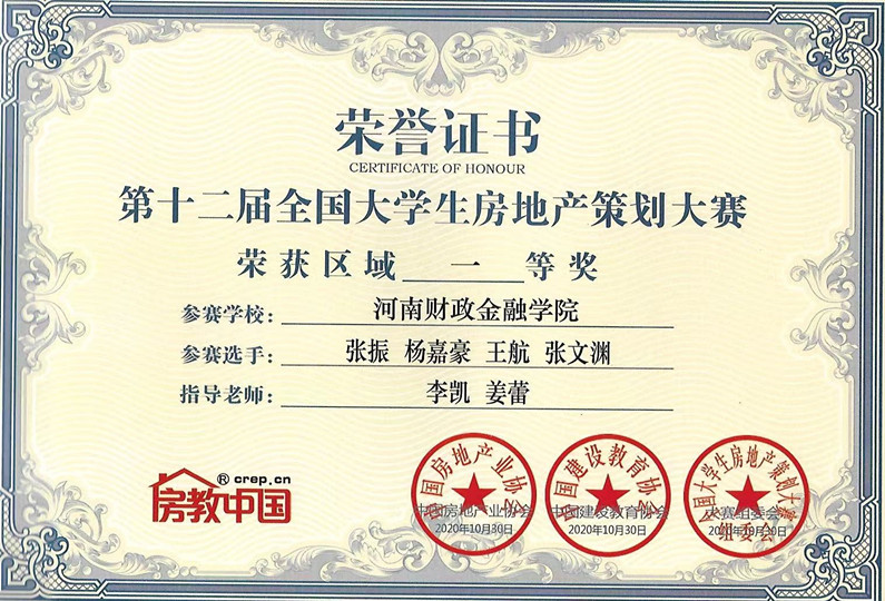 日前,由中国房地产业协会指导、中国建设教育协会主办的第十二届全国大学生房地产策划大赛落下帷幕。由太阳成集团tyc33455cc李凯、姜蕾担任指导老师、18级房地产经营与管理专业张振、杨嘉豪、王航、张文渊4位同学组成的我校代表团队,进入华中区域复赛并荣获华中区域团体一等奖。