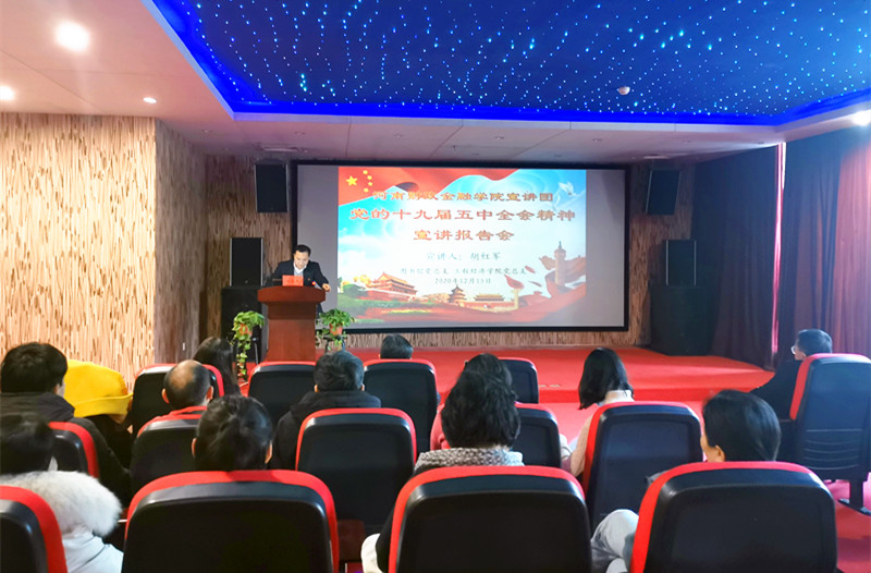 宣讲会上,胡红军首先从党的十九届五中全会的重大意义、主要成果和起草情况讲起,指出党的十九届五中全会是一次具有重大现实意义和深远历史意义的大会、“十四五”规划《建议》是凝聚习近平总书记心血和深谋远虑、汇聚全党全社会智慧的成果。之后,他围绕“深刻学习领会党的十九届五中全会精神”这一主题,分两个部分对我国进入新发展阶段的重大意义、有利条件和重要特征,2035年远景目标和“十四五”时期我国发展的指导方针、主要目标、重点任务以及构建新发展格局的战略构想和重要着力点等方面进行了全面宣讲。他强调,要把学习贯彻五中全会精神与我校实际结合起来,坚持党的全面领导、动员各方面力量为实现“十四五”规划和2035年远景目标而团结奋斗。